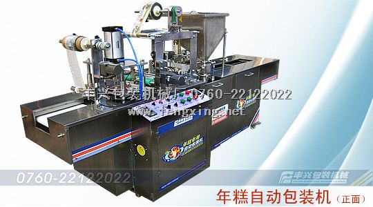 豐興包裝機械在年糕包裝機方面又取得了突破,新近上市一款年糕包裝機,完全是一臺全自動包裝機。它能夠自動下杯,下杯后自動灌裝年糕,然后再自動封口,并且自動打印生產日期和自動切除(切除封口彩印薄膜多余的邊料)等功能,只需預先在控制面板設定好參數,配合一臺輸送機,即可組成一條年糕包裝流水線,無人值機,輕松包裝。減少企業人力財力支出,實現企業自動化生產加工。
